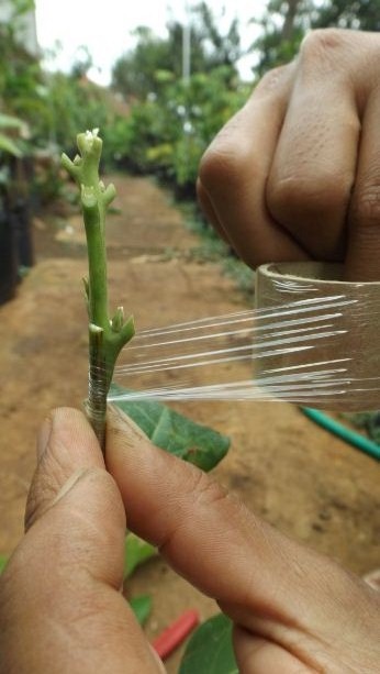 - Sungkup dengan plastic kemudian ikat rapat namun jangan terlalu kencang, untuk menjaga kelembapan supaya batang atas tidak mudah layu saat panas dan tidak berjamur saat hujan.